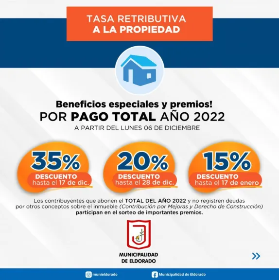 • Una bonificación del 35% (treinta y cinco por ciento) sobre el valor para aquellos contribuyentes que abonen el total de la Tasa Retributiva a la Propiedad Periodo 2022 hasta el día 17 de diciembre de 2021.