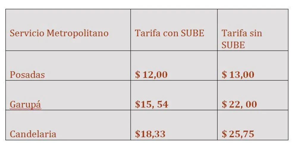 Los nuevos valores serán los siguientes: en Posadas 12 pesos, Garupá 15,54 pesos y Candelaria 18,33 pesos, abonando con SUBE y 13, 22 y 25,75 pesos abonando sin SUBE.