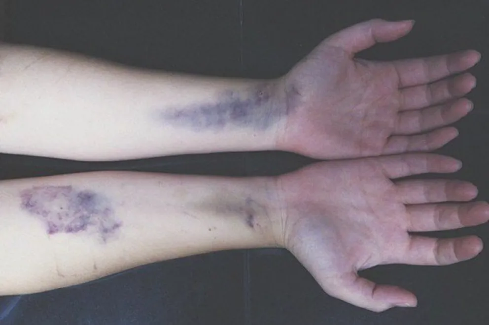 Esos moretones pueden adquirir diferentes colores y tonalidades. De forma más común se vuelven violetas en sus comienzos, por la cantidad de sangre que permanece en los tejidos y, a medida que pasa el tiempo, empieza a desaparecer.