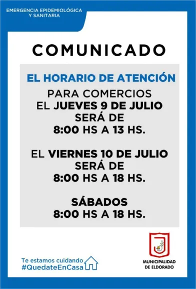 El horario de atención en los distintos comercios de la ciudad para este jueves "Día de la Independencia" será de 8:00 a 13:00 horas. Para el viernes se extiende de 8:00 a 18:00, al igual que el sábado.