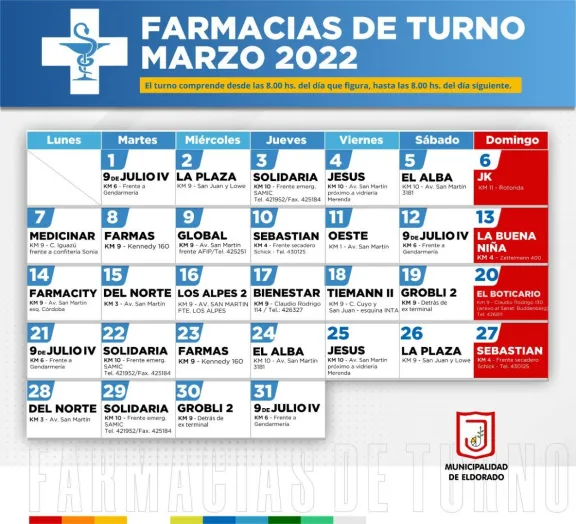 A continuación te damos a conocer el calendario de guardias para las farmacias de Eldorado