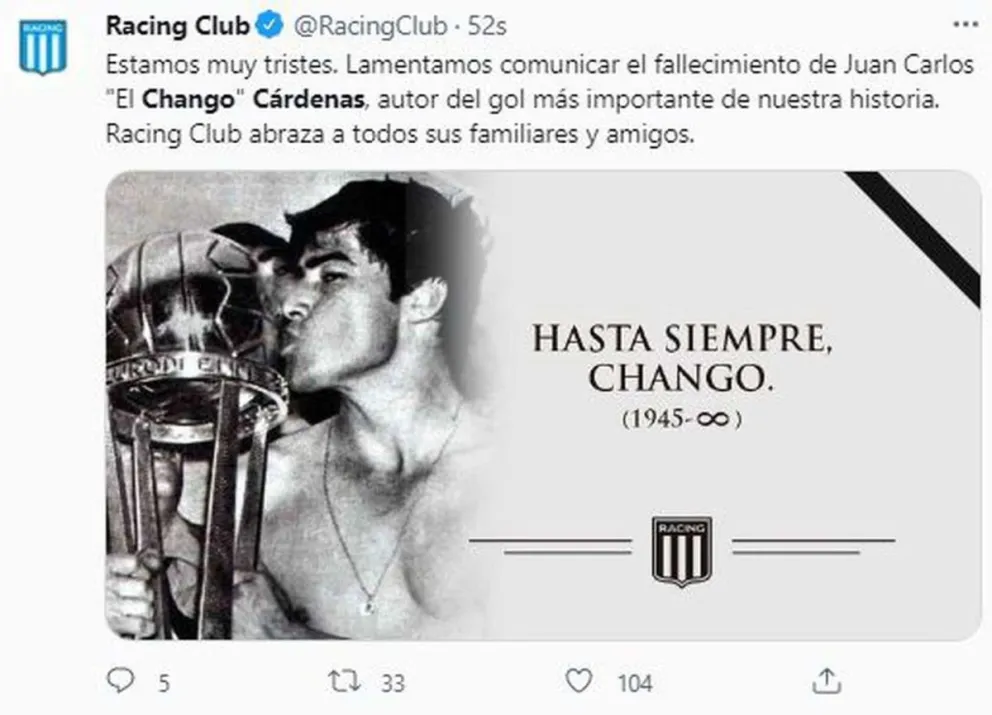 “Estamos muy tristes. Lamentamos comunicar el fallecimiento de Juan Carlos “El Chango” Cárdenas, autor del gol más importante de nuestra historia. Racing Club abraza a todos sus familiares y amigos”, informó el club de Avellaneda en sus redes sociales. Tenía 76 años.