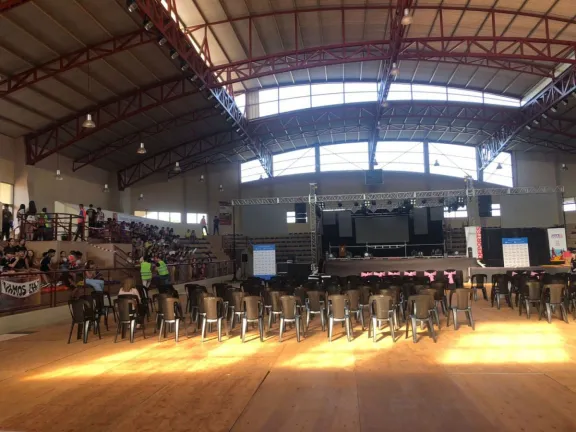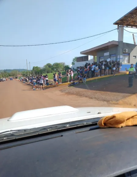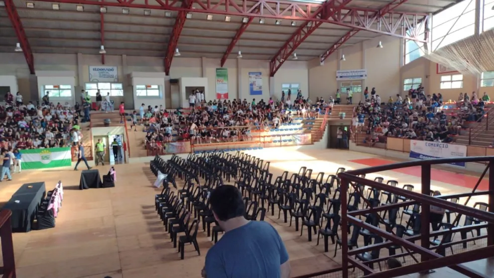 Desde primeras horas de la tarde, estudiantes formaron fila frente a los portones del Polideportivo del kilómetro 3 y a partir de las 16:00 horas comenzaron a ingresar acomodándose en las tribunas para alentar a los concursantes de su escuela.