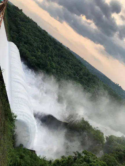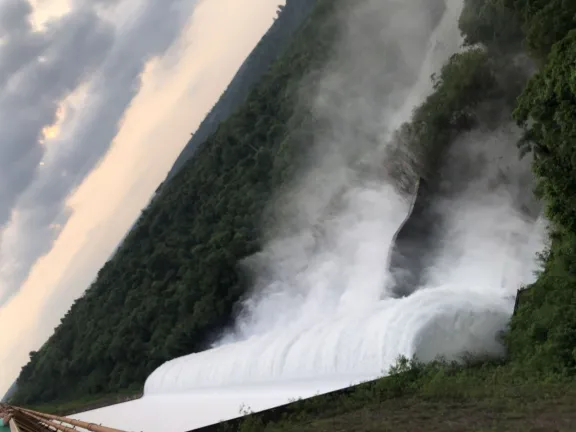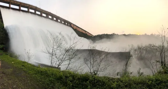 En Puerto Libertad, la represa hidroeléctrica Urugua-í llegó a su cota máxima de 197 metros, y el agua corre por el vertedero brindando un espectáculo de primer nivel que detiene a los que transitan por la RN N° 12, para apreciarlo.