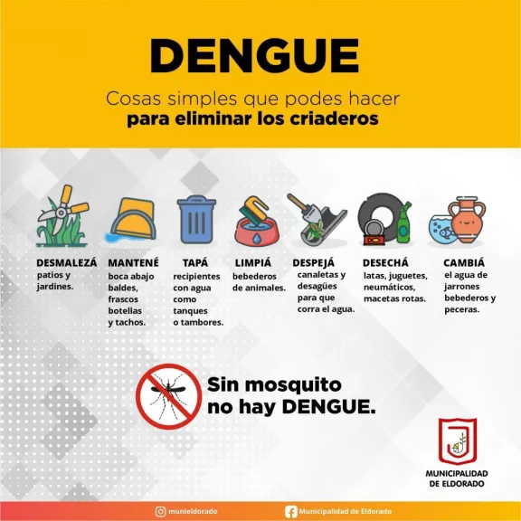 La Secretaría de Ambiente de la Municipalidad de Eldorado recuerda la importancia de tomar medidas de control y prevención para evitar la reproducción del Aedes aegypti, el mosquito transmisor del dengue. Con actividades simples, que se pueden llevar a cabo en los hogares particulares, es posible evitar la propagación de criaderos.