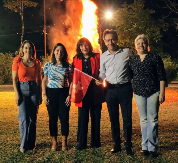 Para culminar el acto se encendió la tradicional fogata con la que se recuerda la forma en que los fundadores del Estado Suizo moderno comunicaban a los cantones vecinos su disposición para conformar el nuevo Estado.