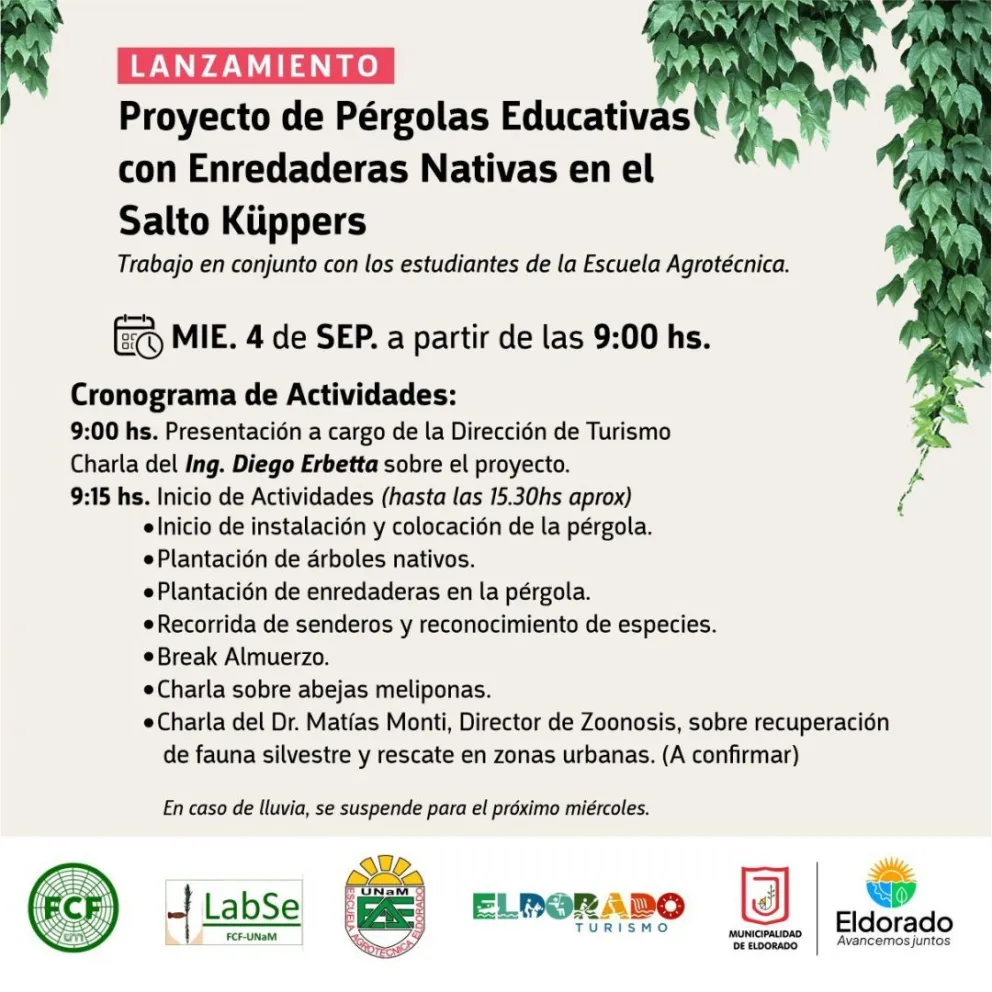 El Parque Natural Municipal Salto Küppers invita a toda la comunidad a participar en el lanzamiento del Proyecto de Pérgolas Educativas con Enredaderas Nativas, que se llevará a cabo el miércoles 4 de septiembre a partir de las 9:00 horas.