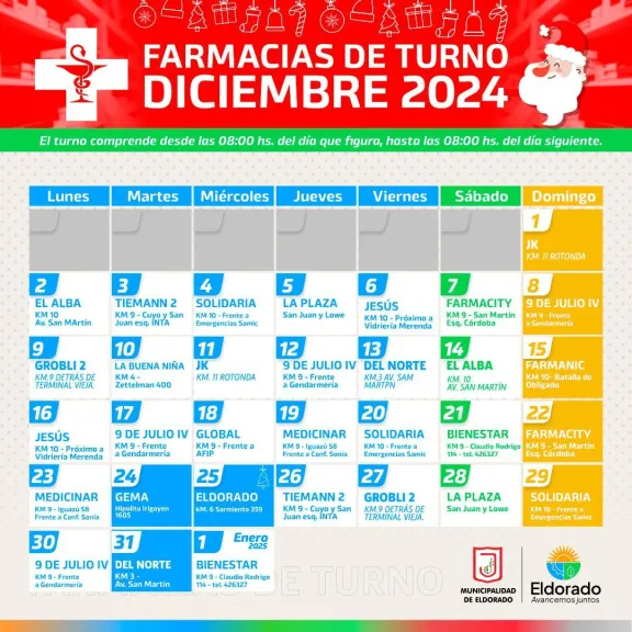03/12/2024 Farmacias de turno para el mes de Diciembre en Eldorado Te puede interesar Se esperan interrupciones en el tránsito este martes 7 Exitoso fin de semana en el Kartódromo Ciudad de Eldorado Robos y destrozos en el sector de cocina y depósito de la Escuela 668 La Policía atrapó a un joven motochorro Karting: La lluvia puso freno a las clasificaciones en Eldorado Secuestraron una motocicleta adulterada y detuvieron a dos jóvenes en el kilómetro 6 Capturaron a "Tierrita" acusado de varios robos y dejar herido a un sereno Seis detenidos por tentativa de robo, uno de ellos por un robo a un local comercial Pareja de jubilados fue víctima de un asalto en el kilómetro 6 Últimas noticias Chikungunya: la expansión del brote en el Noroeste Argentino enciende las alarmas en Misiones Nuevo golpe al bolsillo: el Ahora Gas actualiza su valor de recarga Se esperan interrupciones en el tránsito este martes 7 Suspendieron el paso fronterizo entre Panambí y Porto Vera Cruz Misiones vivió una Semana Santa con una ocupación promedio del 80% Exitoso fin de semana en el Kartódromo Ciudad de Eldorado Robos y destrozos en el sector de cocina y depósito de la Escuela 668 Dos muertos en un choque entre una camioneta y una moto