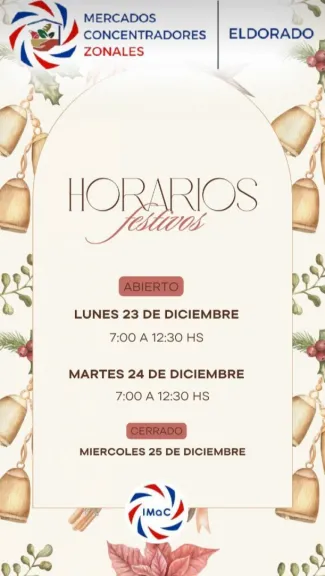 03/12/2024 Horarios festivos en el Mercado Concentrador Zonal de Eldorado Te puede interesar Se esperan interrupciones en el tránsito este martes 7 Exitoso fin de semana en el Kartódromo Ciudad de Eldorado Robos y destrozos en el sector de cocina y depósito de la Escuela 668 La Policía atrapó a un joven motochorro Karting: La lluvia puso freno a las clasificaciones en Eldorado Secuestraron una motocicleta adulterada y detuvieron a dos jóvenes en el kilómetro 6 Capturaron a "Tierrita" acusado de varios robos y dejar herido a un sereno Seis detenidos por tentativa de robo, uno de ellos por un robo a un local comercial Pareja de jubilados fue víctima de un asalto en el kilómetro 6 Últimas noticias Chikungunya: la expansión del brote en el Noroeste Argentino enciende las alarmas en Misiones Nuevo golpe al bolsillo: el Ahora Gas actualiza su valor de recarga Se esperan interrupciones en el tránsito este martes 7 Suspendieron el paso fronterizo entre Panambí y Porto Vera Cruz Misiones vivió una Semana Santa con una ocupación promedio del 80% Exitoso fin de semana en el Kartódromo Ciudad de Eldorado Robos y destrozos en el sector de cocina y depósito de la Escuela 668 Dos muertos en un choque entre una camioneta y una moto