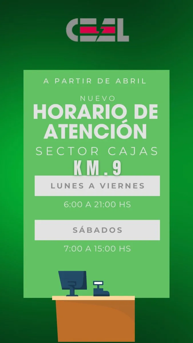 Desde la Cooperativa de Electricidad de Eldorado informan que dispusieron desde el corriente mes de abril un nuevo horario de atención de cajas en el km9 y es de lunes a viernes de 6:00 a 21:00 hs; y sábados de 7:00 a 15 horas.