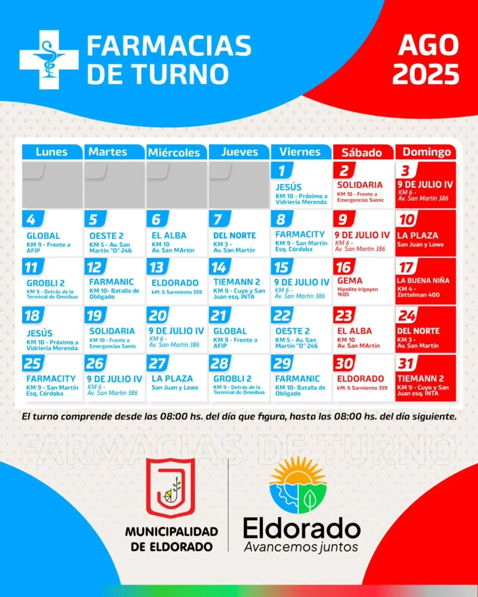 05/08/2025 Farmacias de turno mes de Agosto en Eldorado PARA TENERLO EN CUENTA Te puede interesar Exclusivo: Rodrigo Durán confirmó su intención de buscar la reelección el próximo año Detuvieron al hombre que atacó a la nueva pareja de su ex y secuestraron el arma utilizada Según un informe cae el consumo eléctrico en Misiones Se puso en funcionamiento la División Motorizada de la Unidad Regional III Se encuentran abiertas las inscripciones para el Infanto Juvenil 2026 Irrumpió en la casa de su ex pareja y apuñaló a un hombre en el pecho Intentaron robar una antena y fueron demorados por la Policía Eldorado inaugura un nuevo destacamento policial en Roulet El Gobernador Hugo Passalacqua puso en funcionamiento del punto preventivo y asistencial “Esperanza” en Eldorado Últimas noticias Misiones solicitó a Nación la reducción de la alícuota del IVA al 10,5% para la harina de mandioca Exclusivo: Rodrigo Durán confirmó su intención de buscar la reelección el próximo año Encontraron una yarará dentro de una escuela de Oberá Detuvieron al hombre que atacó a la nueva pareja de su ex y secuestraron el arma utilizada Según un informe cae el consumo eléctrico en Misiones Se puso en funcionamiento la División Motorizada de la Unidad Regional III Se encuentran abiertas las inscripciones para el Infanto Juvenil 2026 Irrumpió en la casa de su ex pareja y apuñaló a un hombre en el pecho