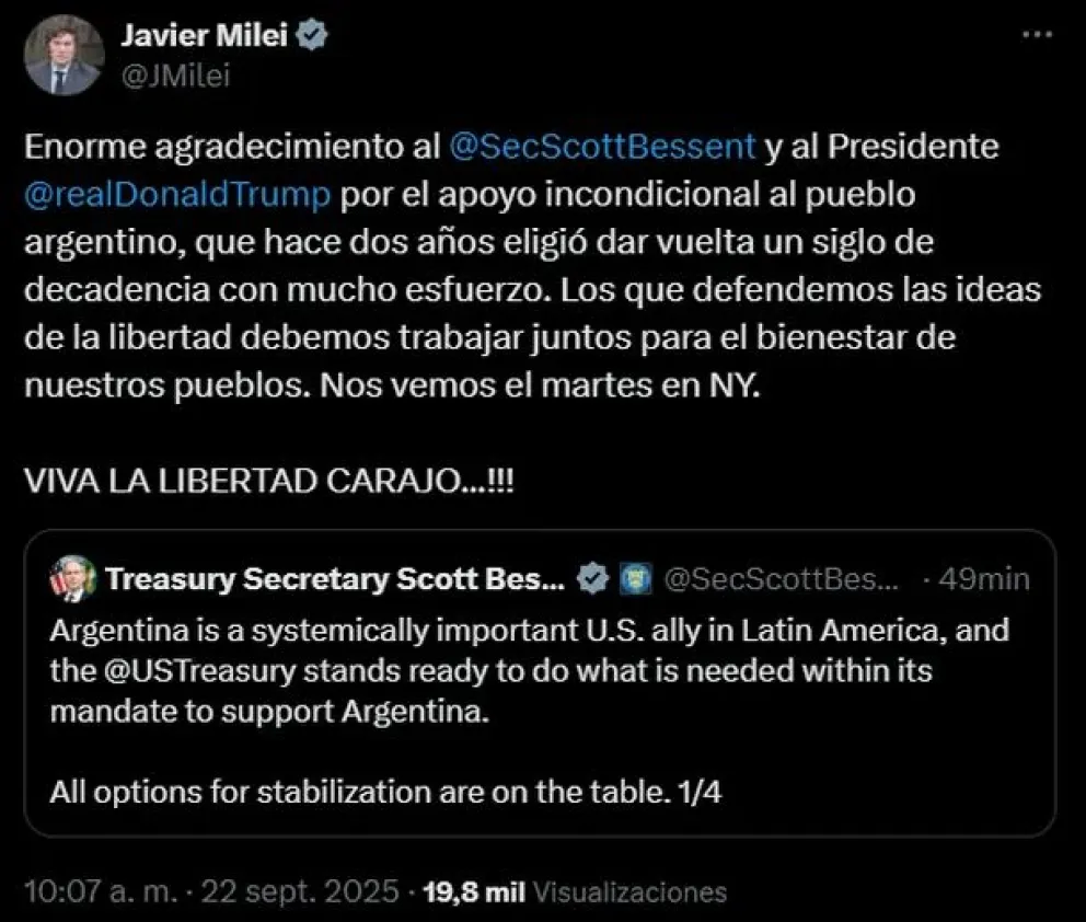 “Enorme agradecimiento al @SecScottBessent y al Presidente @realDonaldTrump por el apoyo incondicional al pueblo argentino, que hace dos años eligió dar vuelta un siglo de decadencia con mucho esfuerzo. Los que defendemos las ideas de la libertad debemos trabajar juntos para el bienestar de nuestros pueblos. Nos vemos el martes en NY. VIVA LA LIBERTAD CARAJO…!!!”, escribió Milei en su cuenta de X.