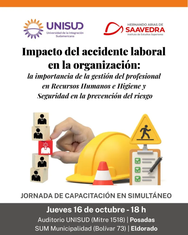 Con el propósito de fortalecer la articulación entre la formación profesional y el mundo del trabajo, la Universidad de la Integración Sudamericana (UNISUD) y el Instituto de Estudios Superiores Hernando Ariasnde Saavedra invitan a participar de la capacitación *“Impacto del accidente laboral en la organización: la importancia de la gestión del profesional en Recursos Humanos e Higiene y Seguridad en la prevención del riesgo”*, que se realizará el *jueves 16 de octubre* a las *18 h*, en modalidad simultánea en dos sedes: Auditorio UNISUD (Mitre 1518, *Posadas*) y SUM de la Municipalidad de *Eldorado* (Bolívar 73).