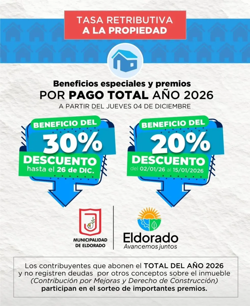La Municipalidad de Eldorado informa que ya se encuentra disponible la posibilidad de abonar la Tasa Retributiva a la Propiedad 2026, con importantes beneficios para los contribuyentes que elijan el pago total anual.