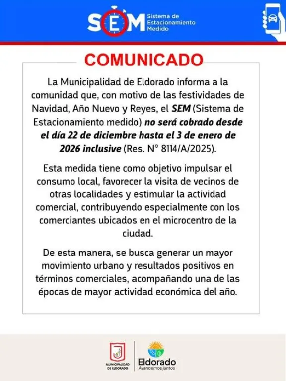 La Municipalidad de Eldorado informa a la comunidad que, con motivo de las festividades de Navidad, Año Nuevo y Reyes, el Sistema de Estacionamiento Medido no será cobrado desde el día 22 de diciembre hasta el 3 de enero de 2026 inclusive (Res. N° 8114/A/2025).