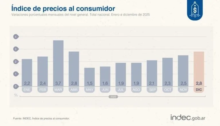 La inflación fue de 2,8 por ciento en diciembre y acumuló 31,5 por ciento en todo 2025.