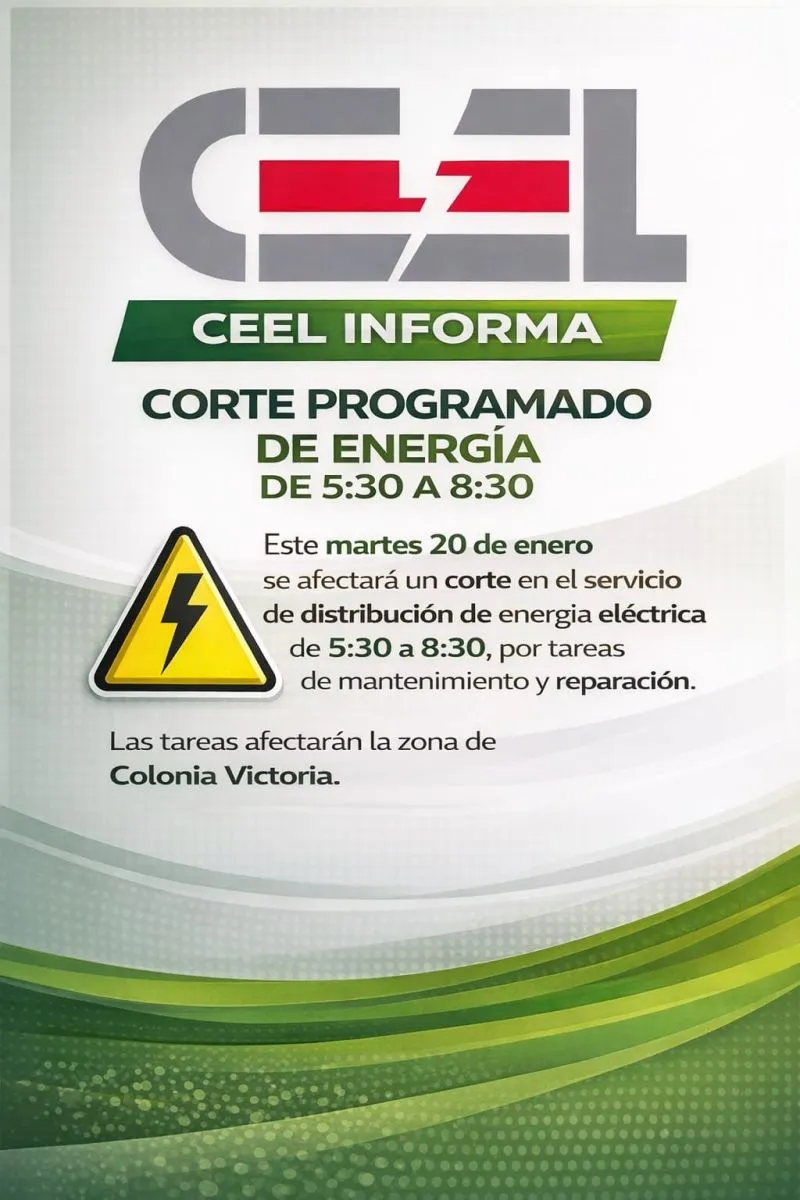19/01/2026 Este martes habrá corte de energía eléctrica en Colonia Victoria Te puede interesar Vialidad de Misiones reactiva su planta de premoldeados Otro nuevo golpe al bolsillo: Autorizan suba del 17,6% en el transporte interurbano Rige el nuevo cuadro tarifario del transporte urbano Sin precio de referencia, el Inym agrava la crisis y enciende la cadena yerbatera Se incendió por completo una vivienda: no hubo heridos Abril comienza con una marcada aceleración en los precios de los servicios, entre ellas las facturas de energía Megaincautación de casi 100 millones en contrabando en un operativo Policial Arrestaron al hombre acusado de balear a su propio hijo y a su nuera en Colonia Alberdi Últimas noticias Crisis en Bomberos de Eldorado: Denuncian desidia, falta de equipamiento y "secuestro" de herramientas universitarias Vialidad de Misiones reactiva su planta de premoldeados Hallaron el cuerpo del hombre desaparecido en un arroyo de Eldorado Marita Vera asumió como Directora de Deportes municipal Buscan a un hombre de 50 años desaparecido en un arroyo de Eldorado Semana Santa: informaron cómo funcionará el servicio de recolección de residuos Consecuencia de la tormenta: voló el techo de una vivienda en el barrio Lomas del Paraná Denuncian a la Asociación de Bomberos Voluntarios de Eldorado por una presunta retención de bienes