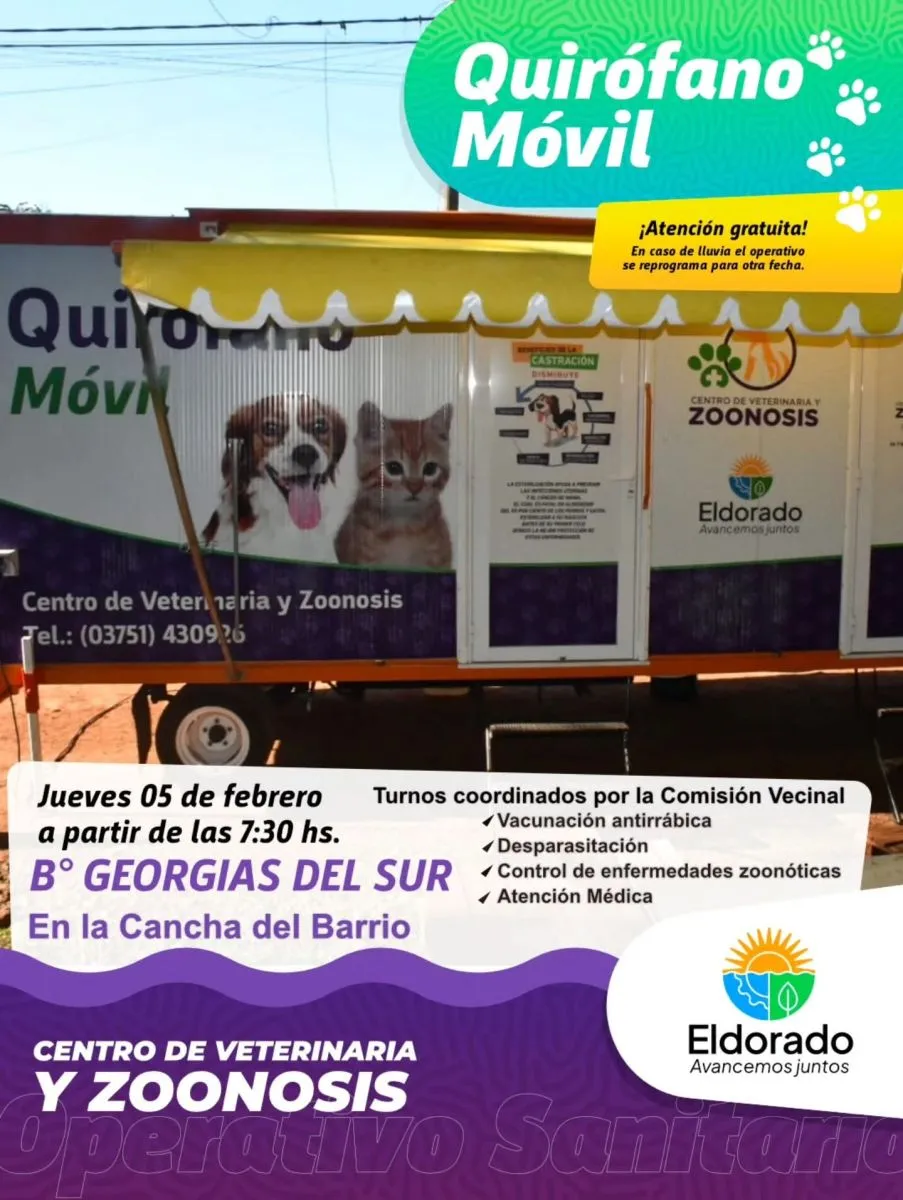 Este jueves, en el marco del Operativo de esterilización de mascotas del Centro de Veterinaria y Zoonosis de Eldorado el Quirófano Móvil estará en el barrio Georgias del Sur a partir de las 7.30 hs.