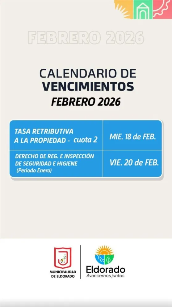 La Municipalidad de Eldorado recuerda las fechas clave para el cumplimiento de tus obligaciones municipales este mes: