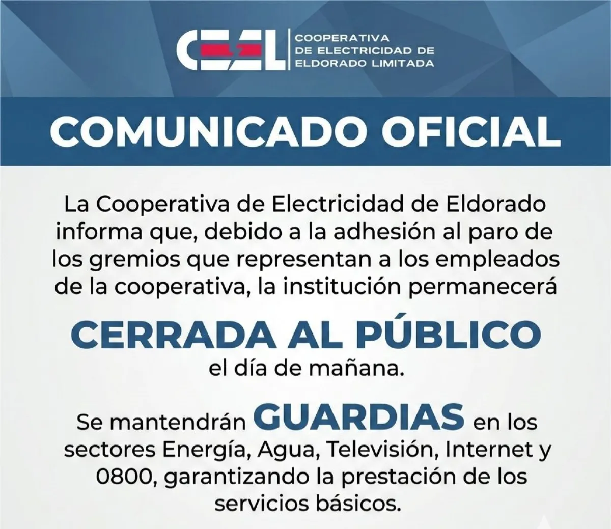 Por su parte desde la Cooperativa de Electricidad Eldorado Limitada emitieron el siguiente comunicado
