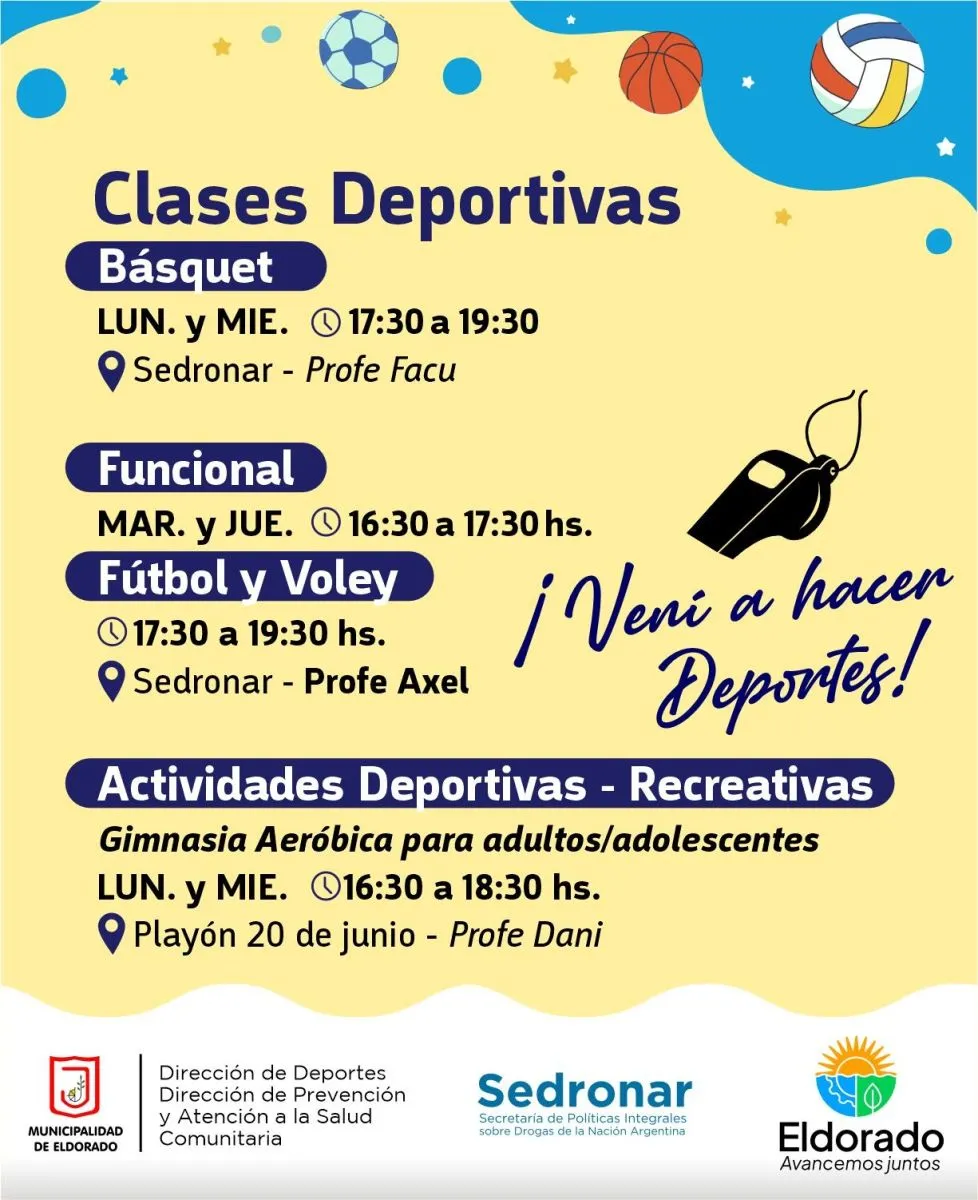 Desde el municipio invitan a participar de las clases deportivas y recreativas que se realizan en el Sedronar y el Playón del B° 20 de Junio.