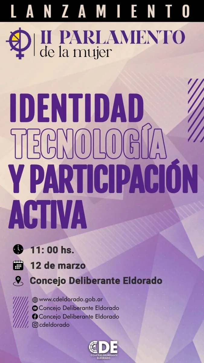 El Concejo Deliberante de Eldorado lanzará el II PARLAMENTO DE LA MUJER, bajo el lema Identidad, Tecnología y Participación Activa, este jueves 12 de marzo a las 11 horas en el recinto de nuestra institución situado en el kilómetro 6.
