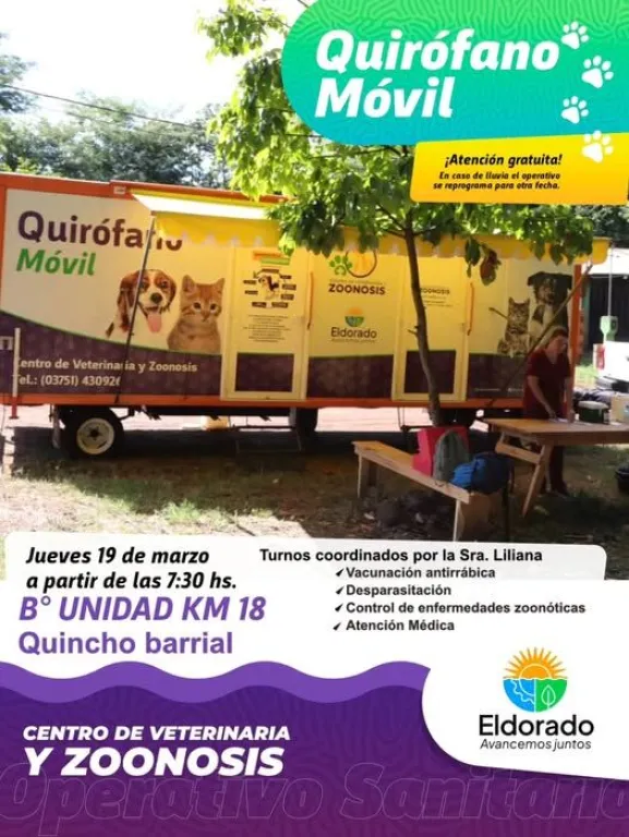 Quirófano Veterinario Móvil Este jueves 19 de marzo se realizará en el quincho del Barrio Unidad km 18 un Operativo de esterilización de mascotas del Centro de Veterinaria y Zoonosis de Eldorado. El mismo dará inicio a partir de las 7.30 hs.