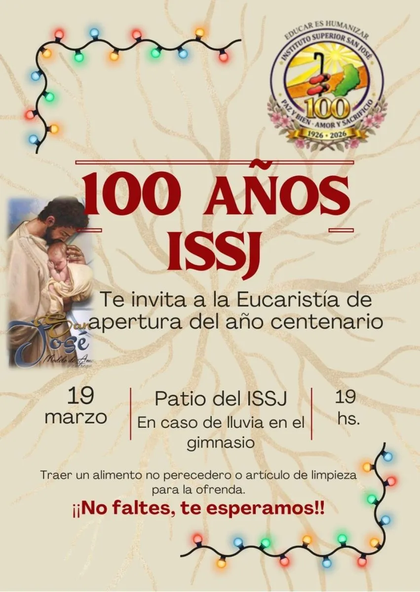 El Instituto Superior San José inicia su año del centenario (100 años) con una Eucaristía este jueves 19 a partir de las 19 horas, en el establecimiento escolar del km 11 que fue declarado por el Concejo Deliberante como sitio histórico y cultural de la ciudad. Como ofrenda o a modo de colaboración para la misa inaugural, se solicita a los asistentes alimentos no perecederos o artículos de limpieza para ser destinados a distintos barrios del kilómetro 1 y 2.