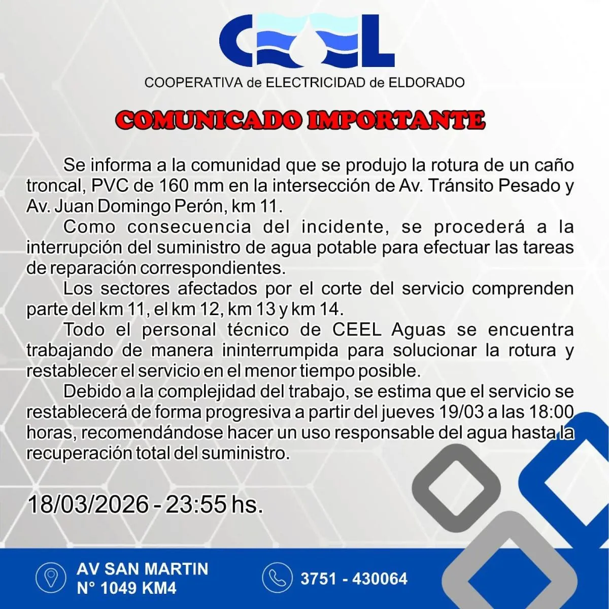 El personal técnico de la Cooperativa se encuentra trabajando en el lugar para solucionar la rotura y restablecer el servicio lo más rápido posible. Estiman desde CEEL Aguas que el servicio comenzará a reestablecerse aproximadamente a las 18 de este jueves 19.