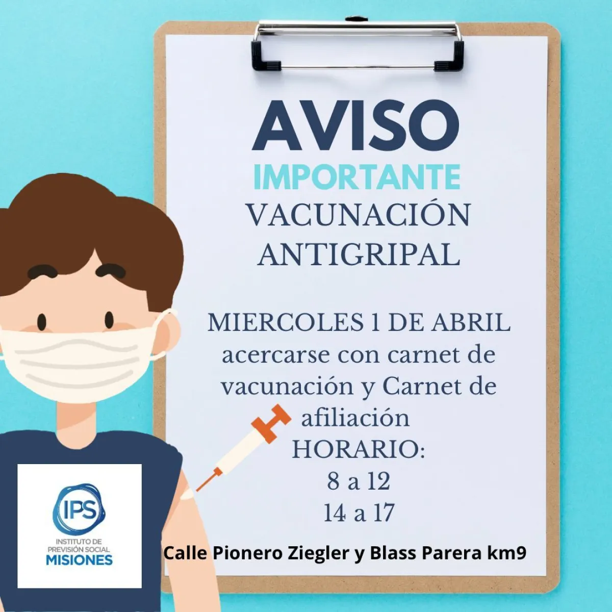 El Instituto de Previsión Social de la provincia de Misiones aplicará este miércoles 1 de abril la vacuna antigripal en la ciudad de Eldorado. Los beneficiarios de recibir la dosis, serán los afiliados activos de la obra social y será en la sede del kilómetro 9.