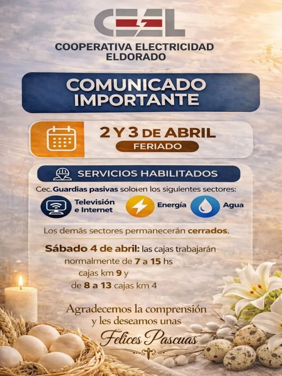 31/03/2026 CEEL: Horarios de atención por Semana Santa Para tenerlo en cuenta Te puede interesar Robo de motocicleta en Wanda: ofrecen recompensa por datos certeros Ofrenda floral en conmemoración del Día del Veterano y los Caídos en la Guerra de Malvinas Detuvieron al agresor de un médico de guardia en el Hospital Samic El "Puente Banana" escenario frecuente de graves siniestros viales Productores de Eldorado y la zona norte recibieron plantines hortícolas Más de 100 vecinos del barrio Sarmiento presentaron documentación en el marco del proceso de regularización de tierras Inseguridad: Robaron un Smart tv de la Escuela 735 Eldorado recibe a la Segunda fecha del Campeonato Misionero de Karting y Superkart Últimas noticias Abril comienza con una marcada aceleración en los precios de los servicios, entre ellas las facturas de energía Megaincautación de casi 100 millones en contrabando en un operativo Policial Siamo Fuori: Italia se quedó afuera del Mundial Robo de motocicleta en Wanda: ofrecen recompensa por datos certeros Arrestaron al hombre acusado de balear a su propio hijo y a su nuera en Colonia Alberdi Colapinto hará una exhibición en Buenos Aires con un auto de Alpine Ofrenda floral en conmemoración del Día del Veterano y los Caídos en la Guerra de Malvinas