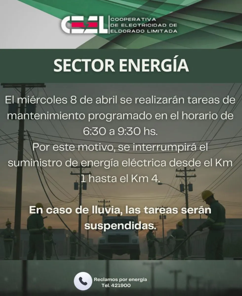 07/04/2026 Suministro de energía interrumpido por tareas de mantenimiento CEEL SECTOR ENERGÍA Te puede interesar Cortan la Ruta Nacional 12 sobre Avenida Fundador Robo millonario a empresario maderero mientras se ausentó de su hogar Se viene el Segundo Festival del Búfalo Misionero Realizarán un Operativo ambiental en el B° Gurtner Crisis hídrica en Eldorado: un relevamiento revela que el 71% de los vecinos sufre cortes recurrentes de agua Vialidad de Misiones realizó ensayos de "calicata" para evaluar el suelo La EFA San Miguel se prepara para el 1 de mayo: una fiesta solidaria para seguir construyendo futuro Farmacias de turno mes de Abril en Eldorado Últimas noticias Diputados convocan a una sesión especial para debatir la reforma de la ley de Glaciares Investigan robo a mano armada frente al Banco Nación Cortan la Ruta Nacional 12 sobre Avenida Fundador Robo millonario a empresario maderero mientras se ausentó de su hogar Se viene el Segundo Festival del Búfalo Misionero Detuvieron a un hombre acusado de abusar de su beba de 2 años Identificaron a los conductores del choque en San Antonio y secuestraron los vehículos involucrados
