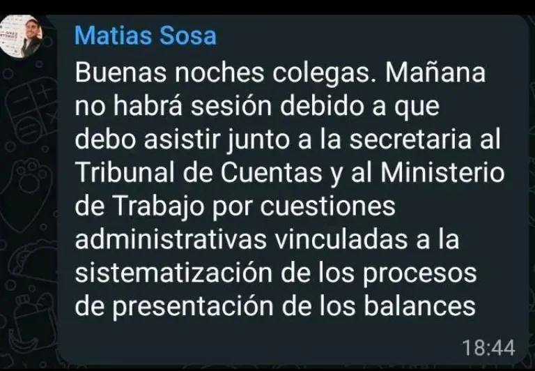 El presidente Matías Sosa comunicó la suspensión de la sesión de hoy alegando citación del Tribunal de Cuentas y el Ministerio de Trabajo por temas de balances.
