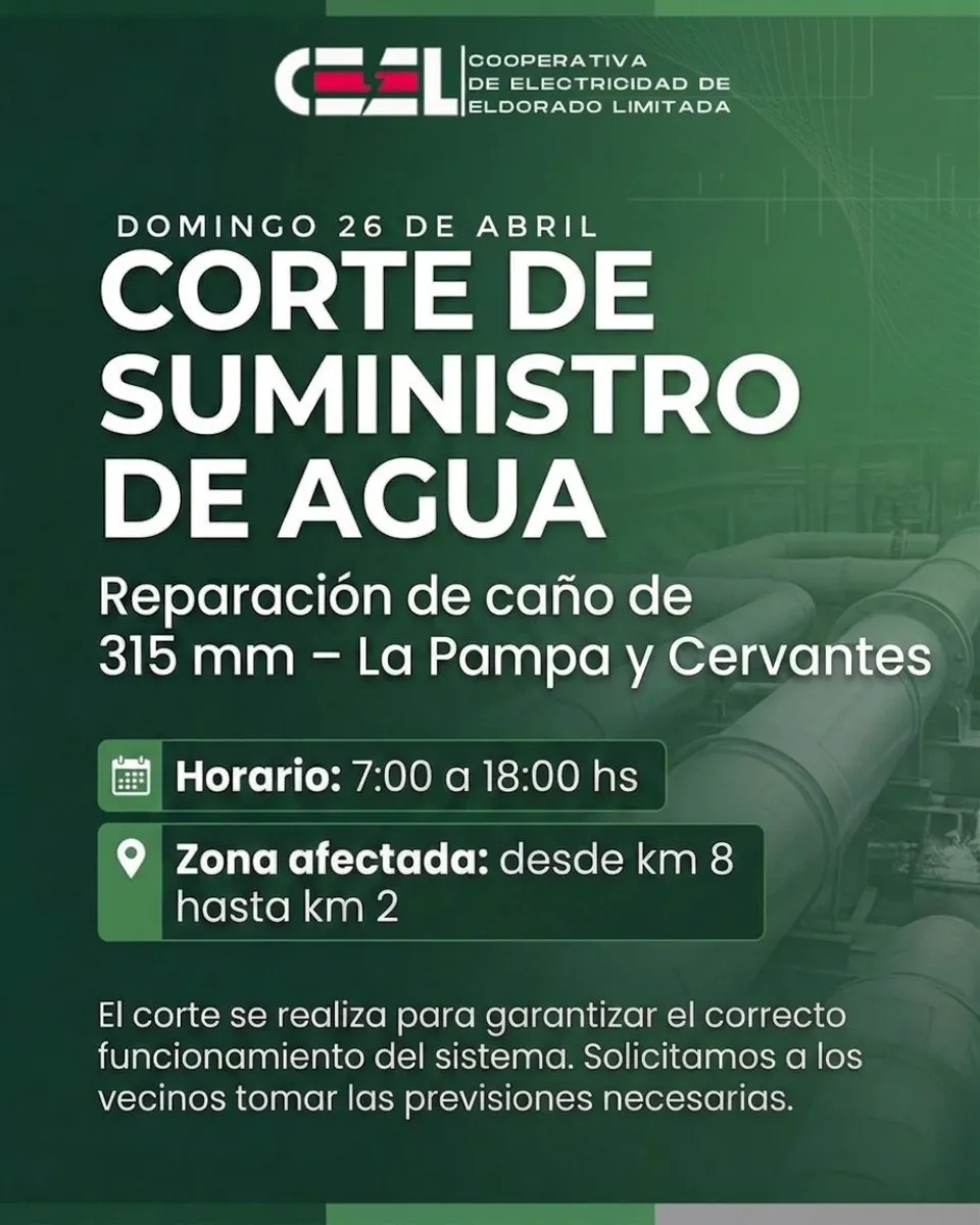 25/04/2026 Este domingo habrá baja presión o faltante del suministro de agua Te puede interesar En asamablea, delegados eligieron los nuevos consejeros de la CEEL y el presidente Kobler adelanto que no buscará su reelección Incendio en una vivienda del barrio Antiguo Centro dejó daños materiales Sacaron de circulación motocicletas robadas Violento tras las rejas: detuvieron a un hombre por grave agresión a su pareja Detuvieron a un hombre y recuperaron varios objetos robados en el Barrio Avanti Día del libro: Gran convocatoria en la Muestra de Arte Itinerante Hospital SAMIC Eldorado: 55 años al servicio de la comunidad Últimas noticias En asamablea delegados eligieron los nuevos concejeros de la CEEL y el presidente Kobler adelanto que no buscará su reelección Incendio en una vivienda del barrio Antiguo Centro dejó daños materiales Sacaron de circulación motocicletas robadas Motociclista alcoholizado despistó y terminó con fracturas Violento tras las rejas: detuvieron a un hombre por grave agresión a su pareja Detuvieron a un hombre y recuperaron varios objetos robados en el Barrio Avanti Día del libro: Gran convocatoria en la Muestra de Arte Itinerante