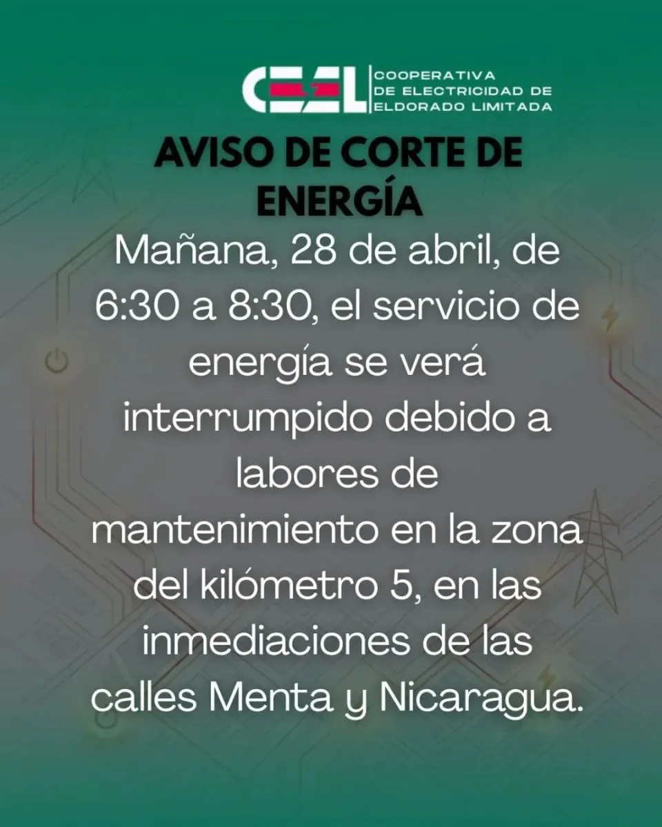 27/04/2026 CEEL: Este martes habrá corte de energía Trabajos programados Te puede interesar Recuerdan que el Registro de las Personas funciona en el Mercado Concentrador del KM 4 González : "el asfaltado de la calle Salto Alegría ya presenta un 30% de ejecución total" Realizarán tareas de poda en los refugios peatonales Nuevos horarios para donar sangre en el Hospital SAMIC Despiste y vuelco en Pozo Azul dejó heridos Este domingo habrá baja presión o faltante del suministro de agua En asamblea, delegados eligieron los nuevos consejeros de la CEEL y el presidente Kobler adelantó que no buscará su reelección Incendio en una vivienda del barrio Antiguo Centro dejó daños materiales Últimas noticias Recuerdan que el Registro de las Personas funciona en el Mercado Concentrador del KM 4 Murió una turista bonaerense tras descompensarse durante un viaje hacia Cataratas Secuestran atados de cigarrillos y neumáticos en encomiendas enviadas desde Misiones Se presentó el "Protocolo para la Prevención, Detección y Actuación ante Riesgos y Violencias Digitales" El sector forestal de Misiones atraviesa una de las crisis más profundas de los últimos años González : "el asfaltado de la calle Salto Alegría ya presenta un 30% de ejecución total" Discutieron, lo apuñaló y terminó detenido por la Policía