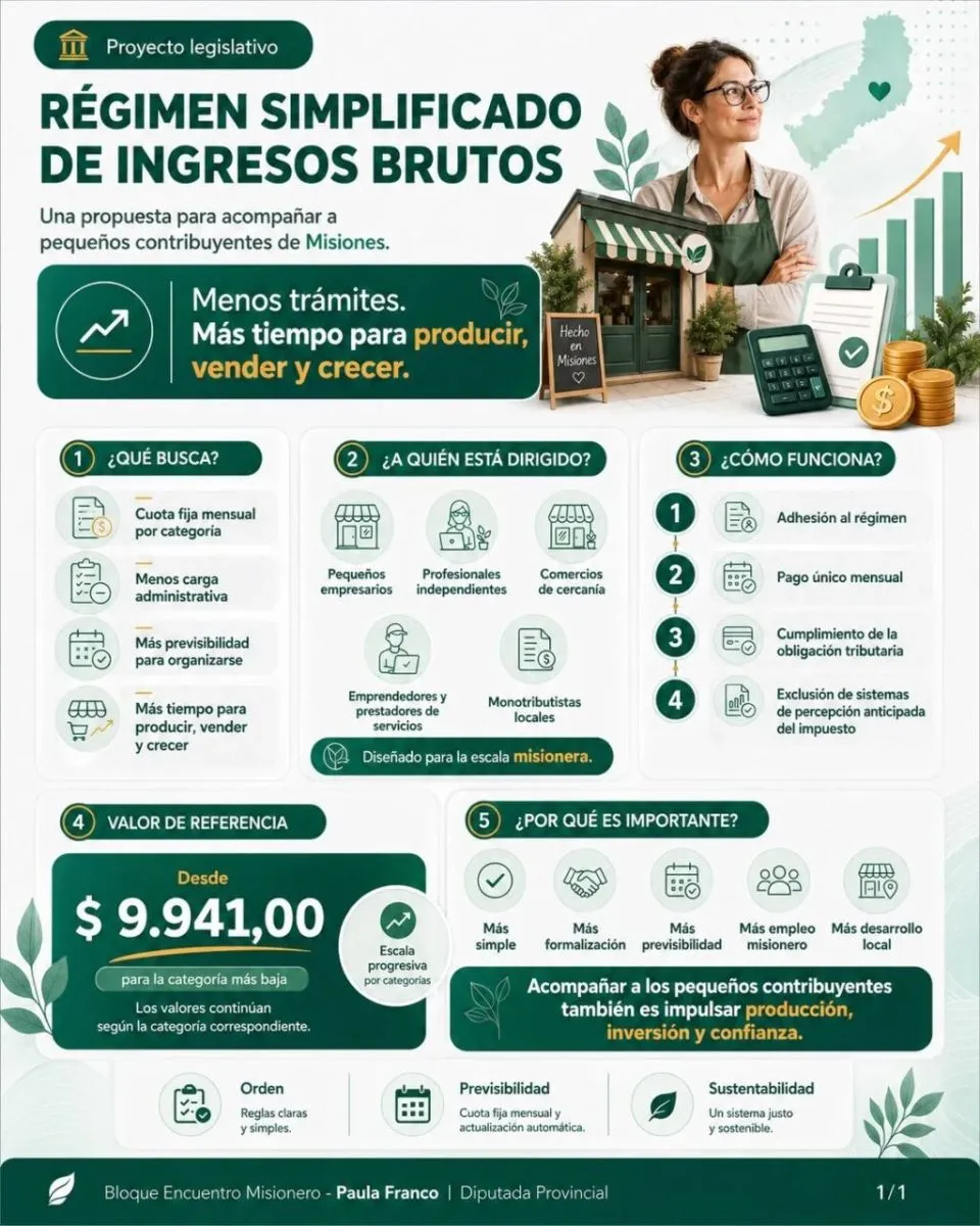 La propuesta legislativa, impulsada por la diputada provincial Paula Franco, con la firma del presidente de la Legislatura, Sebastián Macías y del diputado Carlos Rovira, plantea un esquema de cuota fija mensual por categoría, alineado con el régimen simplificado nacional (Monotributo de ARCA), eliminando la complejidad de declaraciones mensuales variables y reemplazándolas por un sistema más simple, previsible y con menor costo operativo. Misiones se alineará así a regímenes simplificados como tienen otras provincias del país. “Es un tratamiento diferencial que era una deuda pendiente con el monotributista, que le haga ahorrar tiempo y tener menos gastos”, señalaron fuentes oficiales.